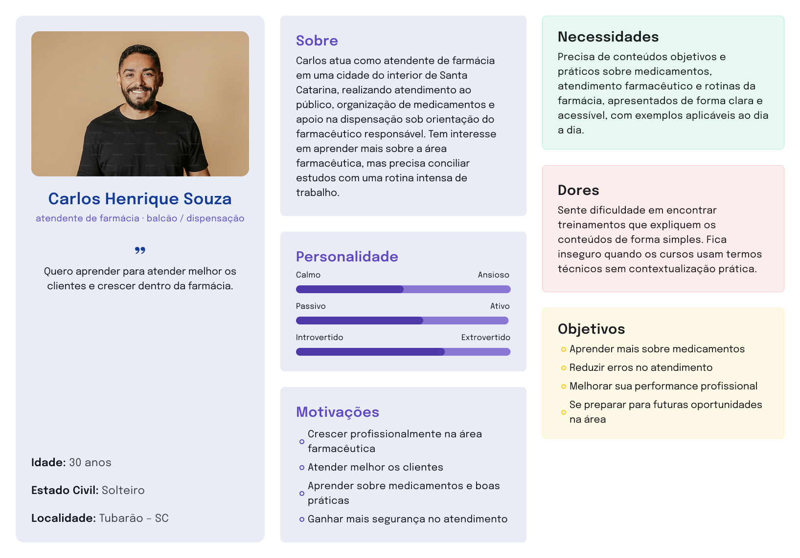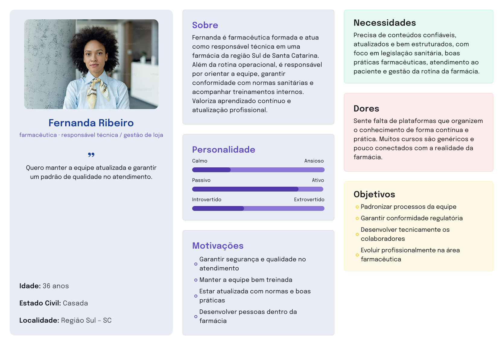 Com base no entendimento do público e nos padrões identificados no benchmarking, foram criadas personas representativas dos principais perfis da plataforma.
