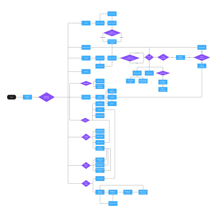 Estruturei a arquitetura da informação da plataforma, organizando cursos, trilhas e dashboards por perfil de usuário.