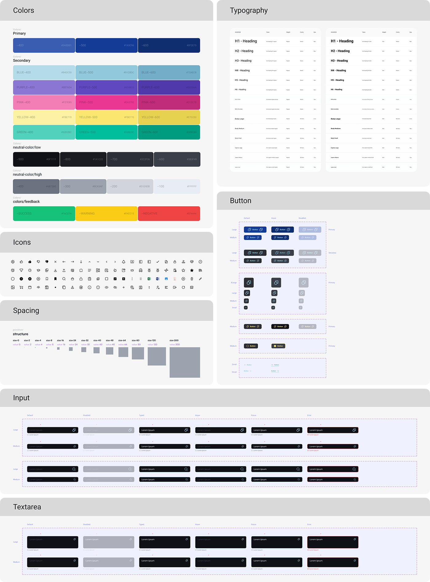 O sistema reúne tokens de cores, tipografia, espaçamentos, botões, inputs, ícones e estados de interação.